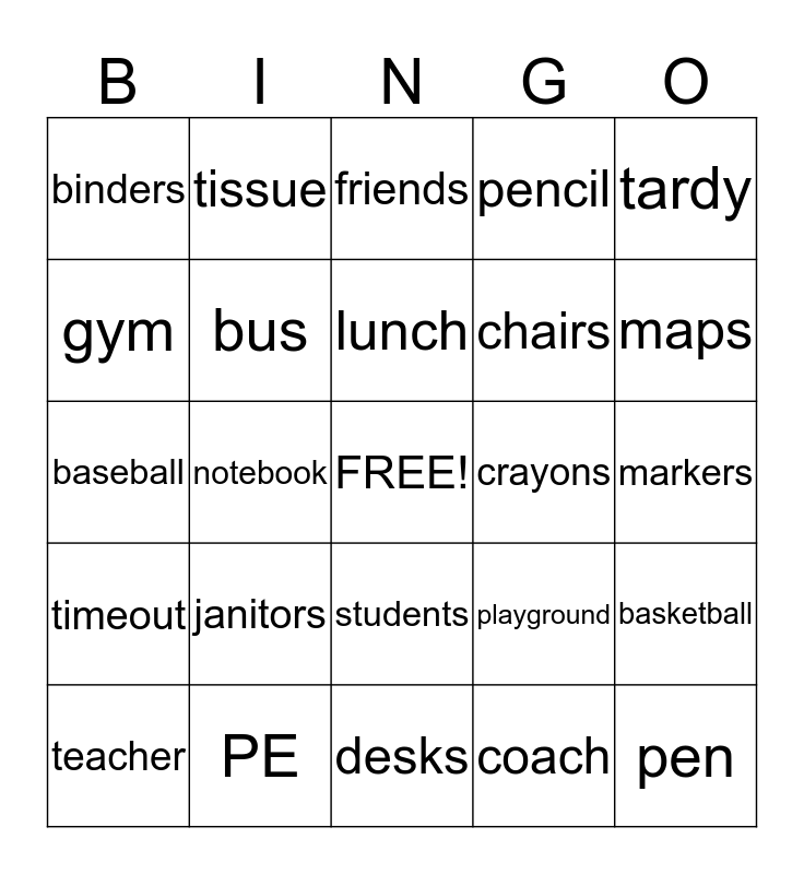 This bingo card has a free space and 39 words: books, chalk, erasers, bus, teacher, students, lunch, recess, tardy, timeout, notebook, pencil, pen, markers, crayons, janitors, principal, binders, room, playground, gym, desks, chairs, maps, worksheets, computer, whiteboard, lunchroom, germex, tissue, staples, candy, friends, PE, coach, football, basketball, baseball and softball.