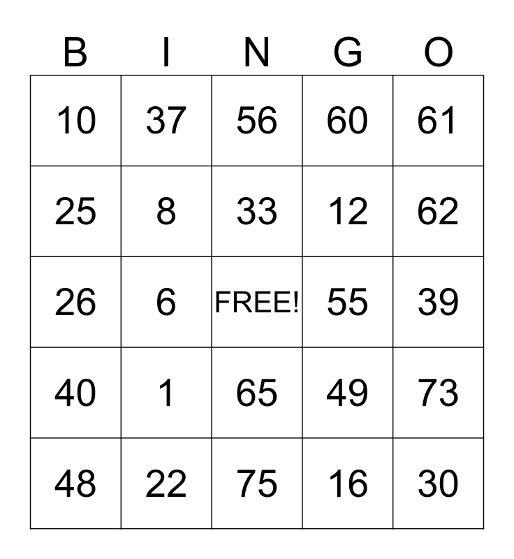 This bingo card has a free space and 24 words: 1, 22, 33, 48, 61, 10, 25, 37, 55, 65, 12, 26, 49, 73, 8, 16, 39, 56, 62, 6, 30, 40, 60 and 75.