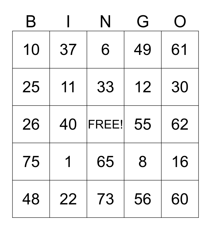 This bingo card has a free space and 24 words: 1, 22, 33, 48, 61, 10, 25, 37, 55, 65, 12, 26, 8, 16, 11, 56, 62, 6, 30, 40, 60, 75, 49 and 73.