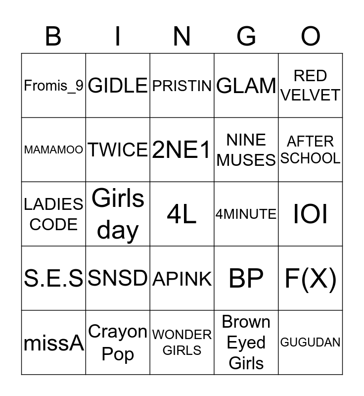 This bingo card has 25 words: SNSD, WONDER GIRLS, 2NE1, missA, RED VELVET, Fromis_9, MAMAMOO, GIDLE, 4MINUTE, APINK, NINE MUSES, LADIES CODE, BP, F(X), TWICE, GUGUDAN, IOI, PRISTIN, AFTER SCHOOL, Girls day, 4L, Crayon Pop, S.E.S, GLAM and Brown Eyed Girls.