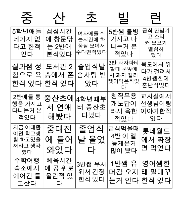 This bingo card has a free space and 24 words: 중대전에 들어와있다, 체육시간에 공 위로 올린적 있다, 졸업식날 솜사탕 받았다, 수학여행 숙소에서 에어컨 틀고잤다, 급식 안남기고 스티커 모으기 열심히 했다, 5학년애들 네가지 없다고 한적 있다, 실과쌤 성함으로 욕한적 있다, 점심시간에 창문닦는 2반애 본적있다, 창작무용 개노답이라서 욕한적있다, 졸업식날 울었다, 3반 과자파티할때 문앞에서 과자 젤리 뺐어먹은적있다, 2반애들 통행증 가지고 다니는거 본적있다, 급식먹을때 4반 이 젤 늦게온거 많이 봤다, 롯데월드에서 짜장면 먹었다, 도서관 2층에서 폰한적 있다, 1반쌤 유머감 오지는거 안다, 교사실에서 선생님이랑 이야기한적있다, 여자애들 쉬는시간에 화장실 모여서 수다떤적있다, 복도에서 뛰다가 걸려서 4반쌤한테 혼난적있다, 중산초에서 연애 해봤다, 영어쌤한테 말대꾸한적 있다, 지금 이때쯤이면 학교생활 하고있을꺼라고 생각했다, 5반쌤 물병가지고 다니는거 본적있다 and 3반쌤 무서워서 긴장한적 있다.