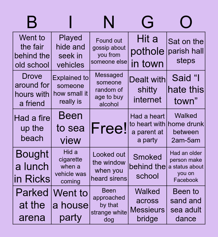 This bingo card has a free space and 24 words: Hid a cigarette when a vehicle was coming, Went to a house party, Messaged someone random of age to buy alcohol, Parked at the arena, Sat on the parish hall steps, Went to the fair behind the old school, Drove around for hours with a friend, Played hide and seek in vehicles, Had a heart to heart with a parent at a party, Looked out the window when you heard sirens, Dealt with shitty internet, Had a fire up the beach, Smoked behind the school, Had an older person make a status about you on Facebook, Explained to someone how small it really is, Walked across Messieurs bridge, Walked home drunk between 2am-5am, Found out gossip about you from someone else, Said “I hate this town”, Been to sea view, Been to sand and sea adult dance, Bought a lunch in Ricks, Hit a pothole in town and Been approached by that strange white dog.