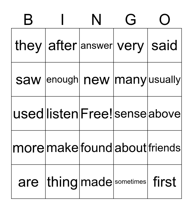 This bingo card has a free space and 29 words: are, easy, listen, second, they, answer, enough, make, sense, thing, above, first, made, sometimes, usually, another, found, more, said, used, about, float, many, saw, very, after, friends, new and sure.