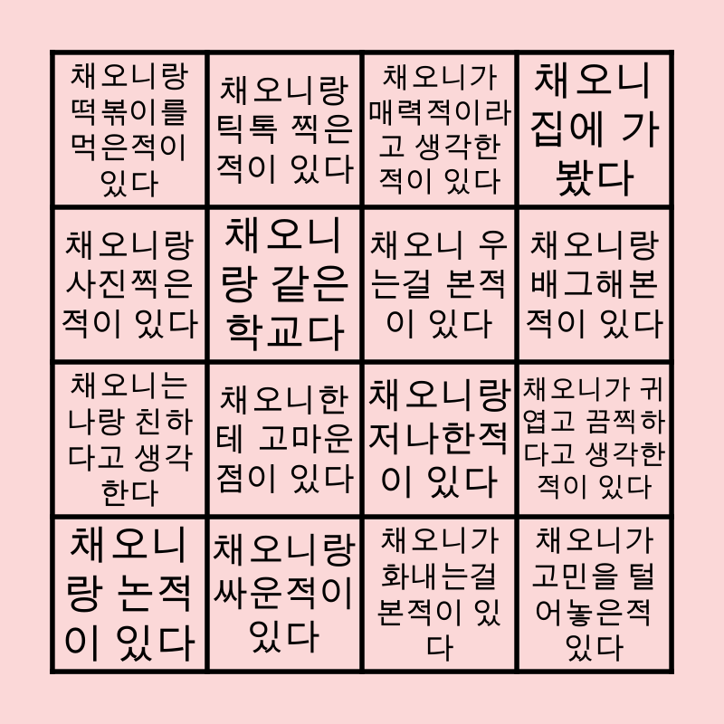 This bingo card has 16 words: 채오니랑 논적이 있다, 채오니랑 싸운적이 있다, 채오니가 매력적이라고 생각한적이 있다, 채오니 집에 가봤다, 채오니랑 사진찍은적이 있다, 채오니랑 틱톡 찍은적이 있다, 채오니랑 저나한적이 있다, 채오니가 귀엽고 끔찍하다고 생각한적이 있다, 채오니랑 떡볶이를 먹은적이 있다, 채오니랑 같은학교다, 채오니가 화내는걸 본적이 있다, 채오니랑 배그해본적이 있다, 채오니는 나랑 친하다고 생각한다, 채오니한테 고마운점이 있다, 채오니 우는걸 본적이 있다 and 채오니가 고민을 털어놓은적 있다.