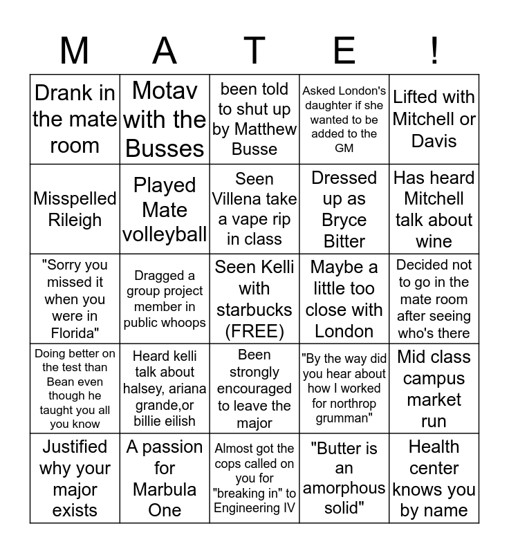 This bingo card has a free space and 24 words: Heard kelli talk about halsey, ariana grande,or billie eilish, A passion for Marbula One, Seen Villena take a vape rip in class, Justified why your major exists, Lifted with Mitchell or Davis, Drank in the mate room, Misspelled Rileigh, Motav with the Busses, Maybe a little too close with London, Been strongly encouraged to leave the major, Dressed up as Bryce Bitter, "Sorry you missed it when you were in Florida", "By the way did you hear about how I worked for northrop grumman", Mid class campus market run, Played Mate volleyball, "Butter is an amorphous solid", Decided not to go in the mate room after seeing who's there, been told to shut up by Matthew Busse, Has heard Mitchell talk about wine, Dragged a group project member in public whoops, Health center knows you by name, Doing better on the test than Bean even though he taught you all you know, Asked London's daughter if she wanted to be added to the GM and Almost got the cops called on you for "breaking in" to Engineering IV.