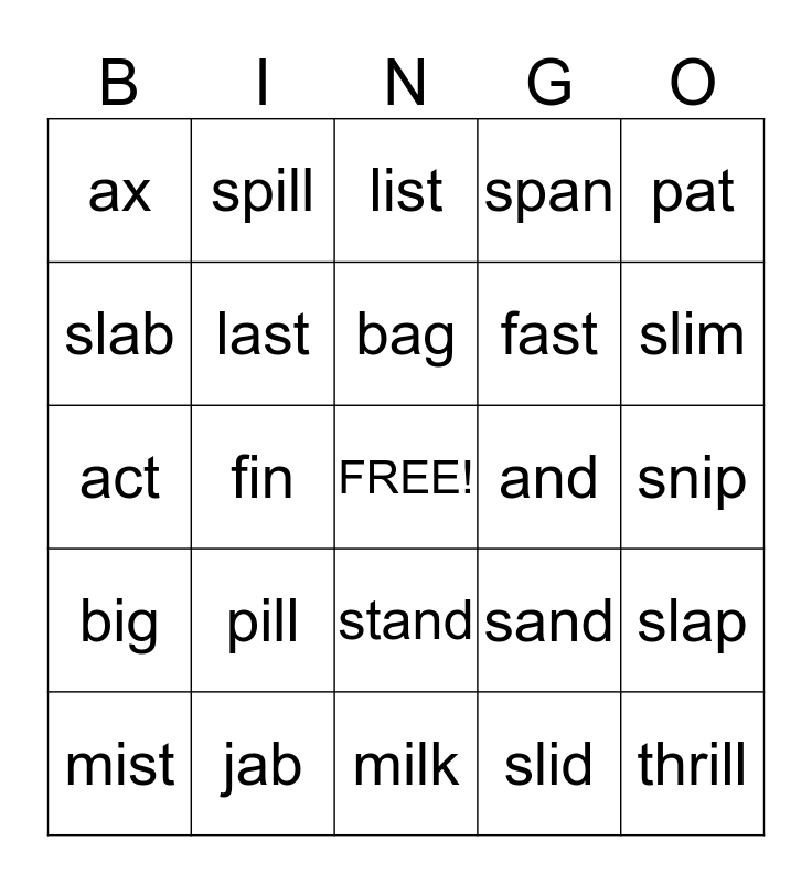 This bingo card has a free space and 24 words: pill, jab, bag, mist, pat, ax, slab, spill, and, stand, fast, act, sand, slap, last, slid, snip, list, slim, fin, thrill, big, span and milk.