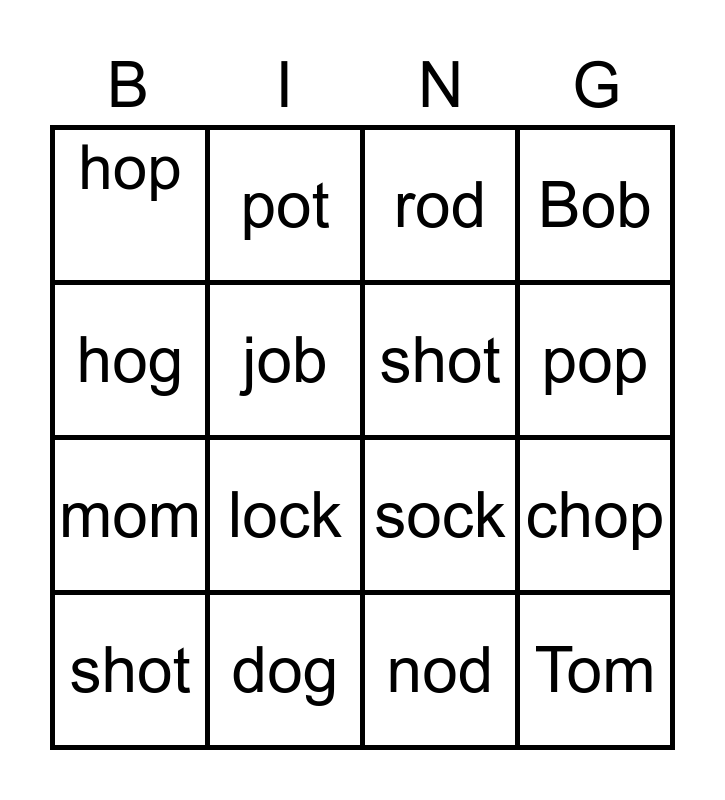 This bingo card has 16 words: dog, chop, rod, hop, mom, pot, sock, nod, hog, job, shot, Bob, lock, pop, shot and Tom.