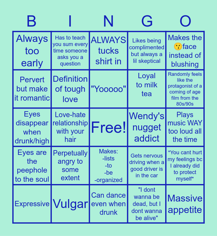 This bingo card has a free space and 24 words: Perpetually angry to some extent, Vulgar, "Yooooo", Expressive, Makes the😗face instead of blushing, Always too early, Pervert but make it romantic, Has to teach you sum every time someone asks you a question, Wendy's nugget addict, Makes: -lists -to -be -organized, Loyal to milk tea, Eyes disappear when drunk/high, Gets nervous driving when a good driver is in the car, *You cant hurt my feelings bc I already did to protect myself*, Definition of tough love, "I dont wanna be dead, but I dont wanna be alive", Plays music WAY too loud all the time, ALWAYS tucks shirt in, Randomly feels like the protagonist of a coming of age film from the 80s/90s, Love-hate relationship with your hair, Massive appetite, Eyes are the peephole to the soul, Likes being complimented but always a lil skeptical and Can dance even when drunk.
