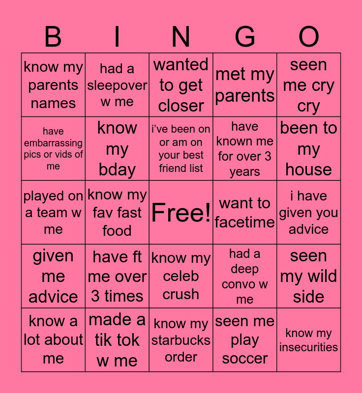 This bingo card has a free space and 24 words: know a lot about me, have ft me over 3 times, i’ve been on or am on your best friend list, seen me play soccer, seen me cry cry, know my parents names, had a sleepover w me, wanted to get closer, want to facetime, i have given you advice, played on a team w me, know my bday, had a deep convo w me, seen my wild side, have embarrassing pics or vids of me, made a tik tok w me, know my starbucks order, met my parents, been to my house, given me advice, know my fav fast food, know my celeb crush, have known me for over 3 years and know my insecurities.