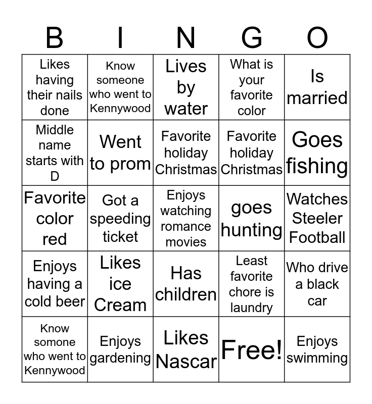 This bingo card has 30 words: Enjoys gardening, Had an embarrassing moment, Got a speeding ticket, Vacationed out of the country, Likes having their nails done, Lives by water, Went to prom, Has children, goes hunting, Likes Nascar, Watches Steeler Football, Enjoys watching romance movies, Free!, Enjoys swimming, Goes fishing, Prefers Italian food, Least favorite chore is laundry, Enjoys having a cold beer, Likes ice Cream, Is married, Favorite color red, Who drives a black car, Know someone who went to Kennywood, Favorite holiday Christmas, Middle name starts with D, What is your favorite color, Who drive a black car, Know somone who went to Kennywood, Favorite holiday Christmas and Middle name starts with D.