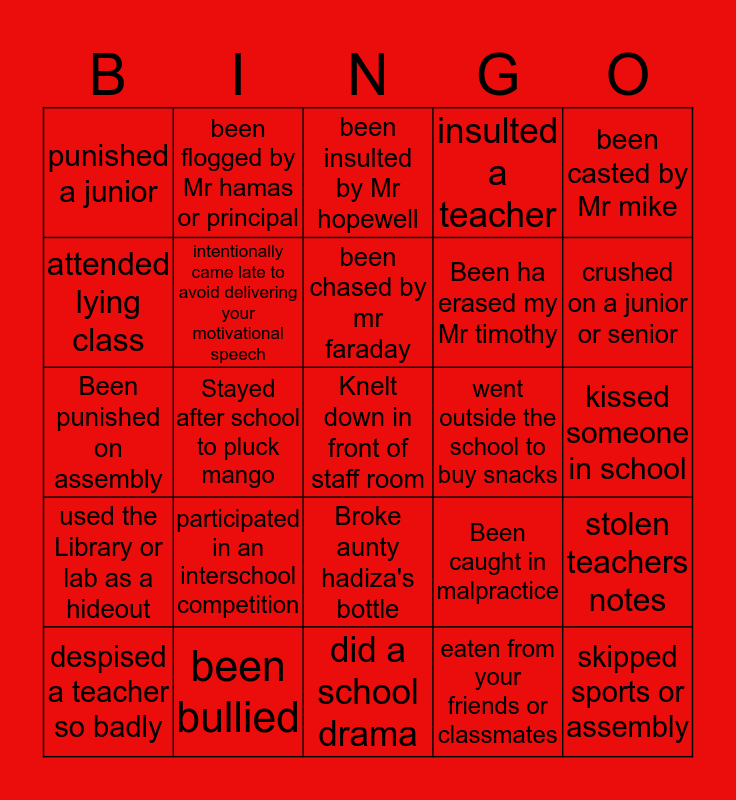 This bingo card has a free space and 34 words: Skipped a class, eaten from your friends or classmates, faked illness to avoid punishment or skip school, vandalized school property, used the Library or lab as a hideout, intentionally came late to avoid delivering your motivational speech, been casted by Mr mike, despised a teacher so badly, been flogged by Mr hamas or principal, Been a prefect, been chased by mr faraday, been insulted by Mr hopewell, climbed window as punishment, been counseled by miss vivian, went outside the school to buy snacks, crushed on a junior or senior, been bullied, Been punished on assembly, participated in an interschool competition, Been caught in malpractice, Broke aunty hadiza's bottle, got into a fight, punished a junior, kissed someone in school, did a school drama, skipped sports or assembly, insulted a teacher, played illegal games in school, Been ha erased my Mr timothy, attended lying class, angered marcus, Stayed after school to pluck mango, stolen teachers notes and Folded your sleeves or flied your shirt.