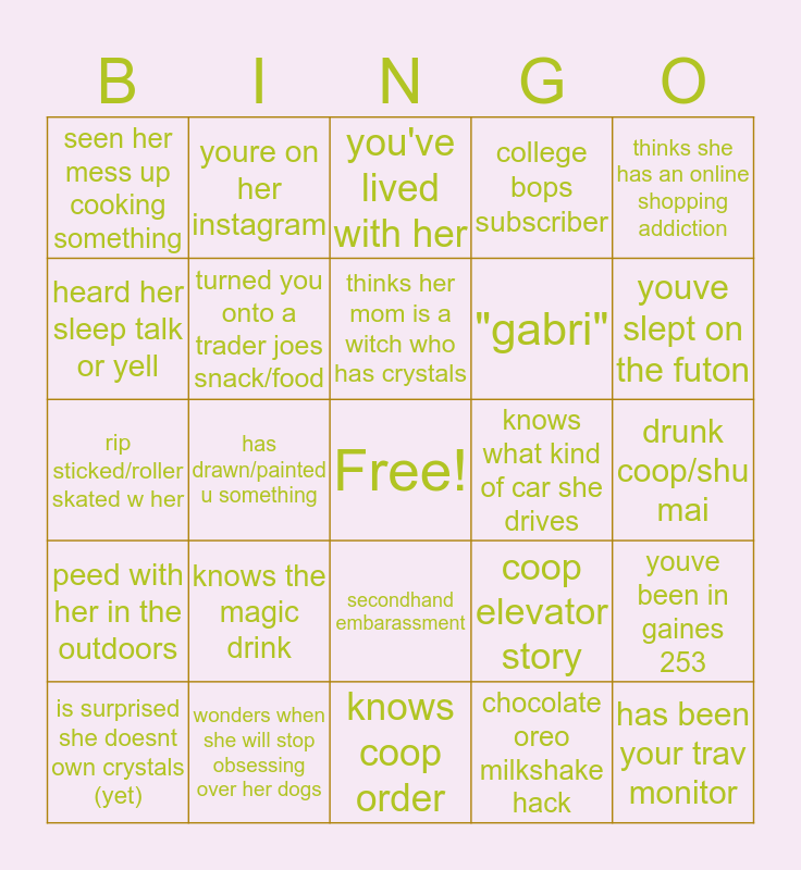 This bingo card has a free space and 24 words: knows the magic drink, wonders when she will stop obsessing over her dogs, thinks her mom is a witch who has crystals, is surprised she doesnt own crystals (yet), thinks she has an online shopping addiction, seen her mess up cooking something, heard her sleep talk or yell, youre on her instagram, knows what kind of car she drives, secondhand embarassment, "gabri", rip sticked/roller skated w her, coop elevator story, youve been in gaines 253, turned you onto a trader joes snack/food, chocolate oreo milkshake hack, drunk coop/shu mai, you've lived with her, youve slept on the futon, has drawn/painted u something, has been your trav monitor, peed with her in the outdoors, college bops subscriber and knows coop order.