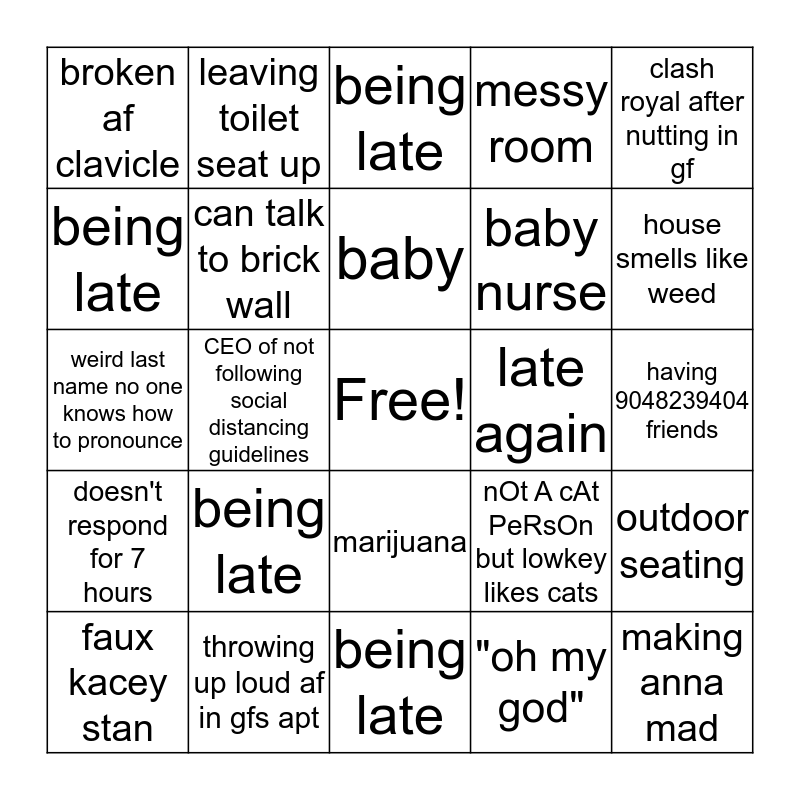 This bingo card has a free space and 24 words: being late, throwing up loud af in gfs apt, baby, faux kacey stan, clash royal after nutting in gf, broken af clavicle, being late, leaving toilet seat up, late again, marijuana, baby nurse, weird last name no one knows how to pronounce, nOt A cAt PeRsOn but lowkey likes cats, outdoor seating, can talk to brick wall, "oh my god", having 9048239404 friends, being late, house smells like weed, CEO of not following social distancing guidelines, making anna mad, doesn't respond for 7 hours, messy room and being late.