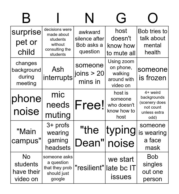 This bingo card has a free space and 29 words: No students have their video on, someone coughs, mic needs muting, forgot to turn mic on, surprise pet or child, awkward silence after Bob asks a question, Ash interrupts, 3+ profs wearing gaming headsets, host is someone who doesn't know how to host, someone asks a question that they prob should just google, 4+ weird backgrounds (scenery does not count unless extra odd), Bob singles out one person, "resilient", we start late bc IT issues, someone is frozen, accidental private chat to Everyone, "the Dean", "Main campus", Bob tries to talk about mental health, phone noise, typing noise, "Hurricane" and/or "Harvey", Using zoom on phone, walking around with video on, changes background during meeting, host doesn't know how to mute all, decisions were made about students without consulting the students, someone is wearing a face mask, someone joins > 20 mins in and "these are _____ times".