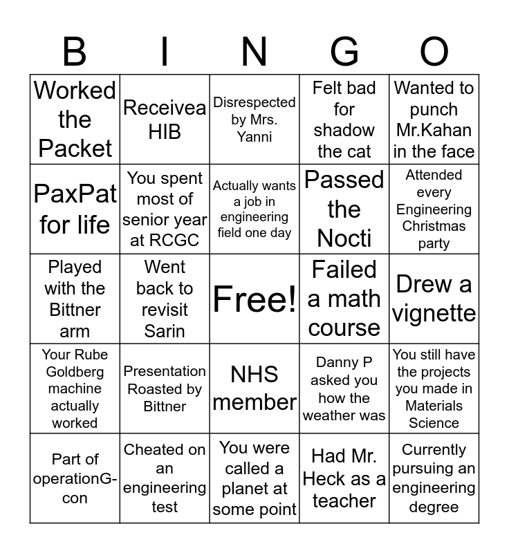 This bingo card has a free space and 24 words: Presentation Roasted by Bittner, Cheated on an engineering test, Actually wants a job in engineering field one day, Part of operationG-con, Wanted to punch Mr.Kahan in the face, Worked the Packet, PaxPat for life, Receivea HIB, Failed a math course, NHS member, Passed the Nocti, Played with the Bittner arm, Danny P asked you how the weather was, You still have the projects you made in Materials Science, You spent most of senior year at RCGC, Had Mr. Heck as a teacher, Drew a vignette, Disrespected by Mrs. Yanni, Attended every Engineering Christmas party, Went back to revisit Sarin, Currently pursuing an engineering degree, Your Rube Goldberg machine actually worked, Felt bad for shadow the cat and You were called a planet at some point.