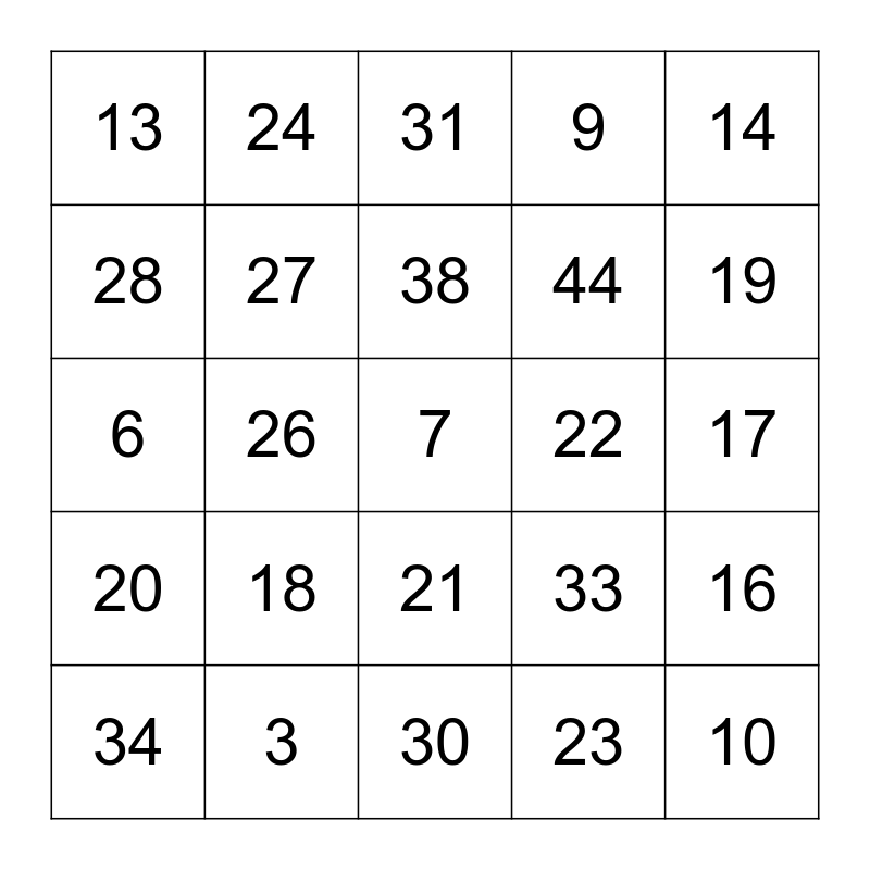 This bingo card has 25 words: 18, 30, 38, 34, 14, 13, 28, 24, 22, 21, 44, 6, 33, 16, 27, 10, 17, 31, 19, 26, 7, 3, 20, 9 and 23.