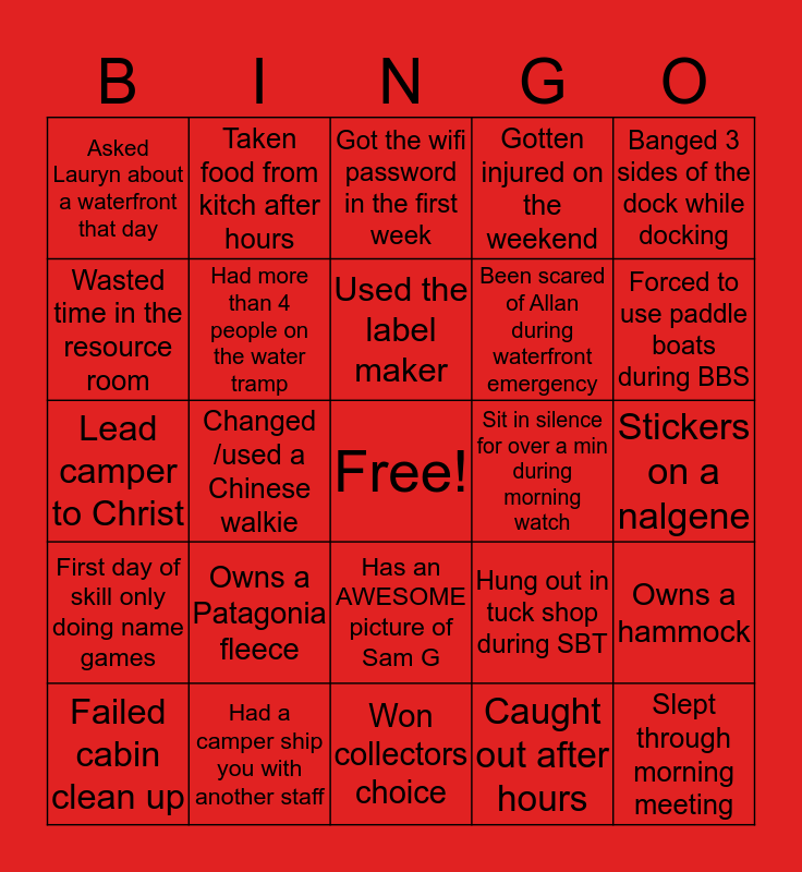 This bingo card has a free space and 24 words: Owns a Patagonia fleece, Had a camper ship you with another staff, Used the label maker, Failed cabin clean up, Banged 3 sides of the dock while docking, Asked Lauryn about a waterfront that day, Wasted time in the resource room, Taken food from kitch after hours, Sit in silence for over a min during morning watch, Has an AWESOME picture of Sam G, Been scared of Allan during waterfront emergency, Lead camper to Christ, Hung out in tuck shop during SBT, Owns a hammock, Had more than 4 people on the water tramp, Caught out after hours, Stickers on a nalgene, Got the wifi password in the first week, Forced to use paddle boats during BBS, Changed /used a Chinese walkie, Slept through morning meeting, First day of skill only doing name games, Gotten injured on the weekend and Won collectors choice.