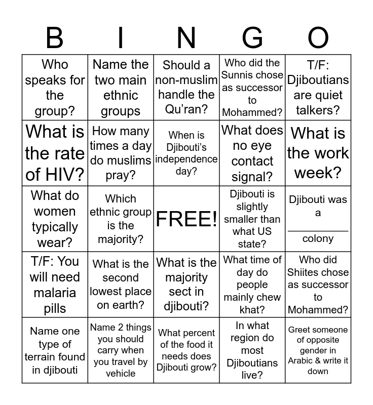 This bingo card has a free space and 50 words: Greet someone in Somali & write down the response, Greet someone of opposite gender in Arabic & write it down, How many regions are in Djibouti and name 2, What percent of the food it needs does Djibouti grow?, What is the second lowest place on earth?, Who is the president and how many terms has he been in office?, Name the two main ethnic groups, Name another person who has amended how many terms they can run for office, What is the rate of HIV?, Name 1 of the articles of faith, How many times a day do muslims pray?, Who did the Sunnis chose as successor to Mohammed?, Who did Shiites chose as successor to Mohammed?, What time of day do people mainly chew khat?, What day is the Islamic holy day?, Name 2 signs of culture shock, When is Djibouti’s independence day?, Djibouti is slightly smaller than what US state?, What is the afar greeting?, T/F: Djiboutians are quiet talkers?, Which ethnic group is the majority?, In what region do most Djiboutians live?, Who speaks for the group?, What does no eye contact signal?, What clothing do men wear?, T/F: Showing the soles of your feet is rude?, What is the work week?, How many pillars of faith? name 2, Should a non-muslim handle the Qu’ran?, What is the majority sect in djibouti?, How many churches in djibouti city?, Djibouti produces what % of its food?, T/F: It is safe to take the ferry?, What is the life expectancy in the city?, Name 2 things you should carry when you travel by vehicle, How much does djibouti spend on khat each year?, Name 2 impacts of khat, Is prostitution legal in djibouti?, T/F: Djibouti city is one of the highest population densities in africa, Djibouti was a __________ colony, Name 2 neighboring countries, Name 2 driving hazards, Where does the new highway from Djibouti city lead to?, How many female legislators are there currently?, Name one type of terrain found in djibouti, What do women typically wear?, What are the two official languages?, T/F: Djibouti is a muslim country, T/F: You will need malaria pills and When was the most recent civil war?.