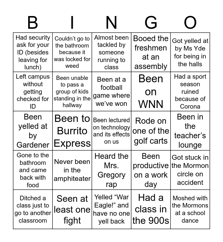 This bingo card has a free space and 24 words: Never been in the amphiteater, Seen at least one fight, Been at a football game where we’ve won, Ditched a class just to go to another classroom, Got yelled at by Ms Yde for being in the halls, Had security ask for your ID (besides leaving for lunch), Left campus without getting checked for ID, Couldn’t go to the bathroom because it was locked for weed, Rode on one of the golf carts, Heard the Mrs. Gregory rap, Been on WNN, Been yelled at by Gardener, Been productive on a work day, Got stuck in the Mormon circle on accident, Been unable to pass a group of kids standing in the hallway, Had a class in the 900s, Been in the teacher’s lounge, Almost been tackled by someone running to class, Had a sport season ruined because of Corona, Been to Burrito Express, Moshed with the Mormons at a school dance, Gone to the bathroom and came back with food, Booed the freshmen at an assembly and Yelled “War Eagle!” and have no one yell back.
