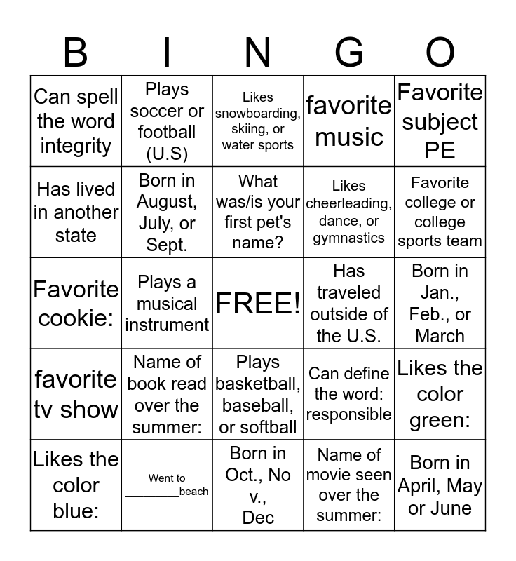 This bingo card has a free space and 24 words: Name of book read over the summer:, Went to _________beach, What was/is your first pet's name?, Likes the color blue:, Favorite subject PE, Can spell the word integrity, Has lived in another state, Plays soccer or football (U.S), Has traveled outside of the U.S., Plays basketball, baseball, or softball, Likes cheerleading, dance, or gymnastics, Favorite cookie:, Can define the word: responsible, Likes the color green:, Born in August, July, or Sept., Name of movie seen over the summer:, Born in Jan., Feb., or March, Likes snowboarding, skiing, or water sports, Favorite college or college sports team, Plays a musical instrument, Born in April, May or June, favorite tv show, favorite music and Born in Oct., Nov., Dec.