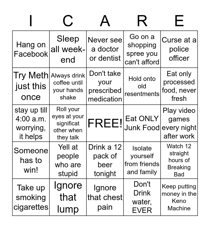This bingo card has a free space and 24 words: Yell at people who are stupid, Ignore that lump, Don't take your prescribed medication, Take up smoking cigarettes, Curse at a police officer, Hang on Facebook, Try Meth just this once, Sleep all week-end, Eat ONLY Junk Food, Drink a 12 pack of beer tonight, Hold onto old resentments, stay up till 4:00 a.m. worrying, it helps, Isolate yourself from friends and family, Watch 12 straight hours of Breaking Bad, Always drink coffee until your hands shake, Don't Drink water, EVER, Play video games every night after work, Never see a doctor or dentist, Eat only processed food, never fresh, Roll your eyes at your significat other when they talk, Keep putting money in the Keno Machine, Someone has to win!, Go on a shopping spree you can't afford and Ignore that chest pain.