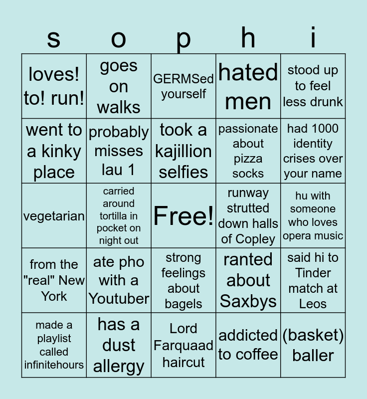 This bingo card has a free space and 24 words: ate pho with a Youtuber, has a dust allergy, took a kajillion selfies, made a playlist called infinitehours, stood up to feel less drunk, loves! to! run!, went to a kinky place, goes on walks, runway strutted down halls of Copley, strong feelings about bagels, passionate about pizza socks, vegetarian, ranted about Saxbys, said hi to Tinder match at Leos, probably misses lau 1, addicted to coffee, hu with someone who loves opera music, GERMSed yourself, had 1000 identity crises over your name, carried around tortilla in pocket on night out, (basket) baller, from the "real" New York, hated men and Lord Farquaad haircut.
