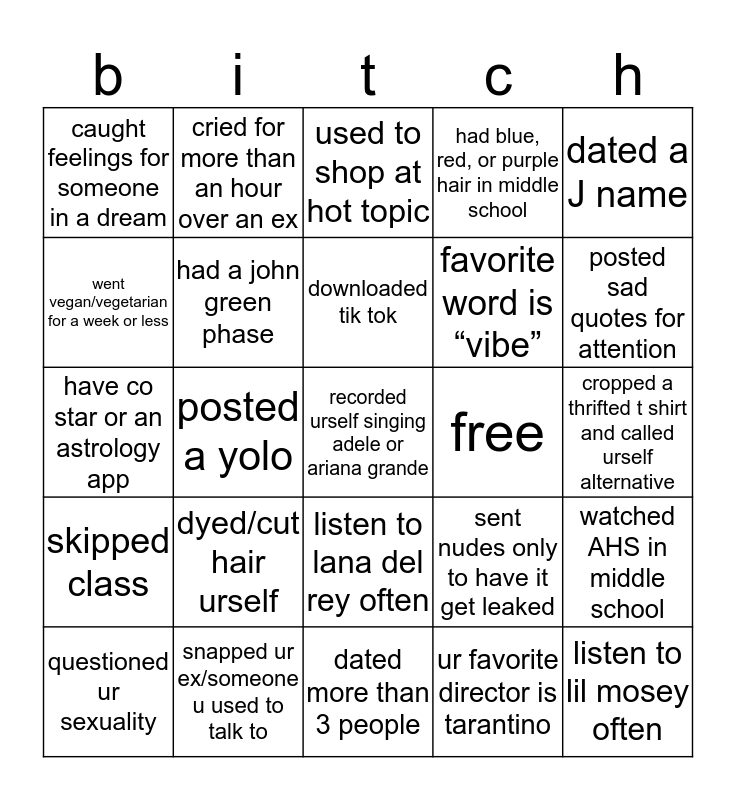 This bingo card has a free space and 24 words: dyed/cut hair urself, snapped ur ex/someone u used to talk to, downloaded tik tok, questioned ur sexuality, dated a J name, caught feelings for someone in a dream, went vegan/vegetarian for a week or less, cried for more than an hour over an ex, free, listen to lana del rey often, favorite word is “vibe”, have co star or an astrology app, sent nudes only to have it get leaked, watched AHS in middle school, had a john green phase, ur favorite director is tarantino, cropped a thrifted t shirt and called urself alternative, used to shop at hot topic, posted sad quotes for attention, posted a yolo, listen to lil mosey often, skipped class, had blue, red, or purple hair in middle school and dated more than 3 people.
