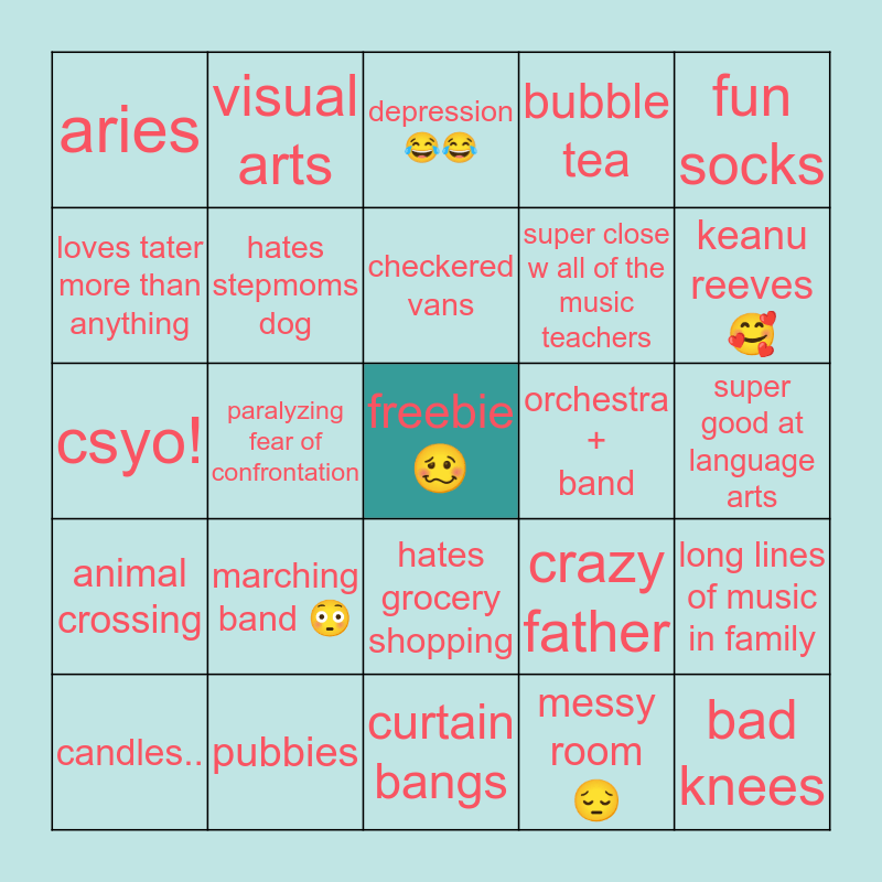 This bingo card has a free space and 24 words: marching band 😳, pubbies, checkered vans, candles.., fun socks, aries, loves tater more than anything, visual arts, orchestra + band, hates grocery shopping, super close w all of the music teachers, csyo!, crazy father, long lines of music in family, hates stepmoms dog, messy room 😔, super good at language arts, depression 😂😂, keanu reeves 🥰, paralyzing fear of confrontation, bad knees, animal crossing, bubble tea and curtain bangs.