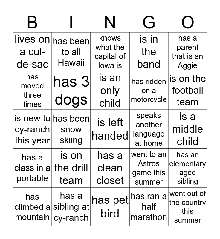 This bingo card has 25 words: is on the drill team, has pet bird, is an only child, has climbed a mountain, has a parent that is an Aggie, lives on a cul-de-sac, has moved three times, has been to all Hawaii, speaks another language at home, has a clean closet, has ridden on a motorcycle, is new to cy-ranch this year, went to an Astros game this summer, has an elementary aged sibling, has 3 dogs, went out of the country this summer, is a middle child, knows what the capital of Iowa is, is on the football team, has been snow skiing, is left handed, has a sibling at cy-ranch, has a class in a portable, is in the band and has ran a half marathon.
