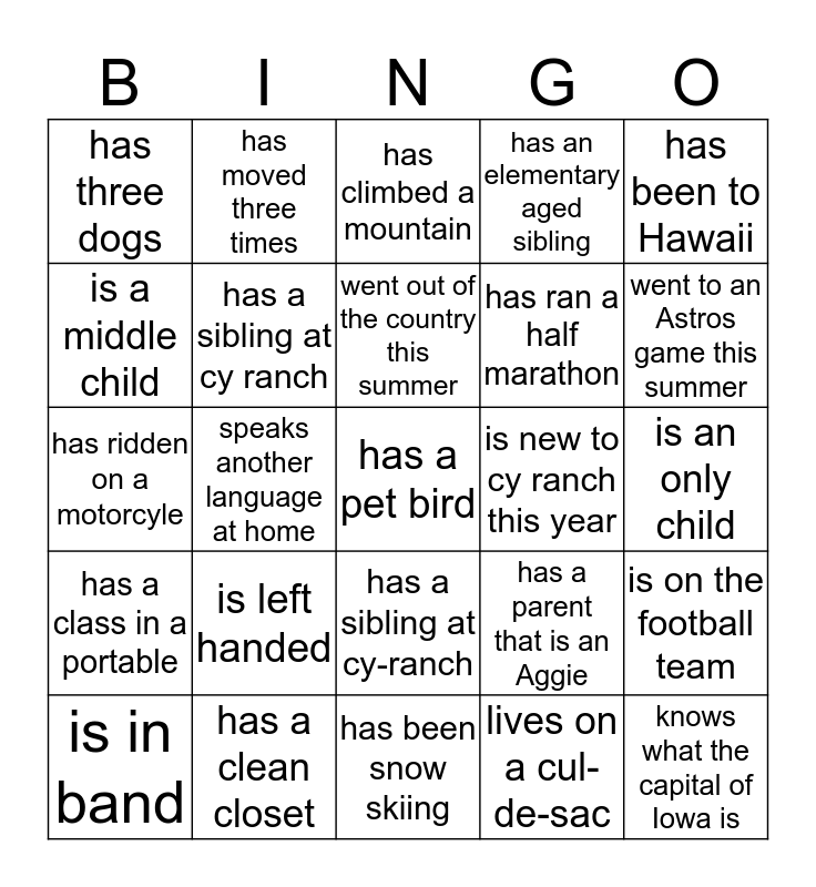 This bingo card has a free space and 24 words: is left handed, has a clean closet, went out of the country this summer, is in band, has been to Hawaii, has three dogs, is a middle child, has moved three times, is new to cy ranch this year, has a sibling at cy-ranch, has ran a half marathon, has ridden on a motorcyle, has a parent that is an Aggie, is on the football team, has a sibling at cy ranch, lives on a cul-de-sac, is an only child, has climbed a mountain, went to an Astros game this summer, speaks another language at home, knows what the capital of Iowa is, has a class in a portable, has an elementary aged sibling and has been snow skiing.