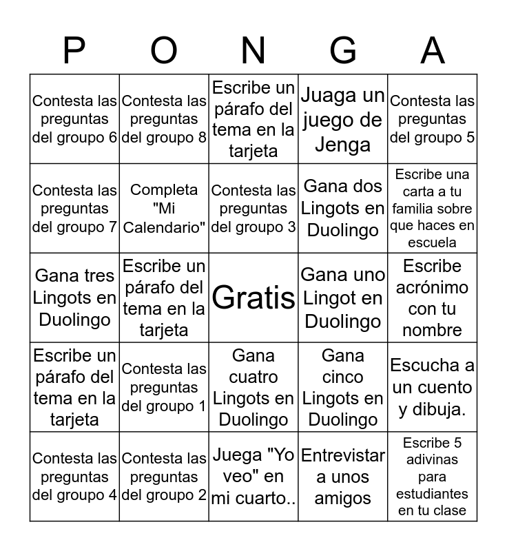 This bingo card has a free space and 24 words: Contesta las preguntas del groupo 1, Contesta las preguntas del groupo 2, Contesta las preguntas del groupo 3, Contesta las preguntas del groupo 4, Contesta las preguntas del groupo 5, Contesta las preguntas del groupo 6, Contesta las preguntas del groupo 7, Contesta las preguntas del groupo 8, Gana uno Lingot en Duolingo, Gana cuatro Lingots en Duolingo, Gana dos Lingots en Duolingo, Gana tres Lingots en Duolingo, Gana cinco Lingots en Duolingo, Escucha a un cuento y dibuja., Completa "Mi Calendario", Entrevistar a unos amigos, Escribe acrónimo con tu nombre, Escribe un párafo del tema en la tarjeta, Escribe una carta a tu familia sobre que haces en escuela, Escribe un párafo del tema en la tarjeta, Escribe 5 adivinas para estudiantes en tu clase, Escribe un párafo del tema en la tarjeta, Juaga un juego de Jenga and Juega "Yo veo" en mi cuarto...