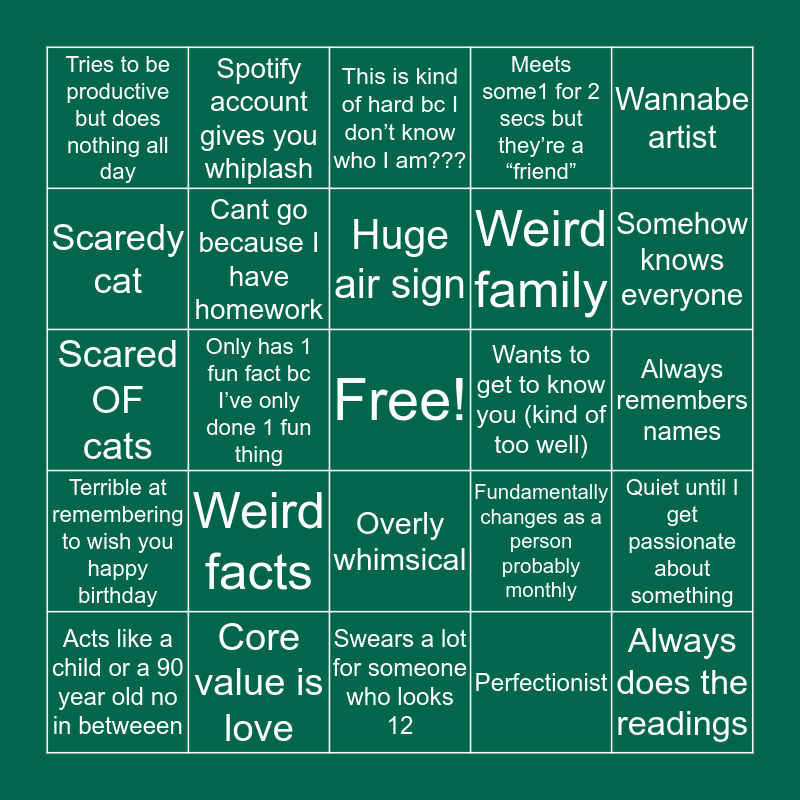This bingo card has a free space and 24 words: Weird facts, Core value is love, Huge air sign, Acts like a child or a 90 year old no in betweeen, Wannabe artist, Tries to be productive but does nothing all day, Scaredy cat, Spotify account gives you whiplash, Wants to get to know you (kind of too well), Overly whimsical, Weird family, Scared OF cats, Fundamentally changes as a person probably monthly, Quiet until I get passionate about something, Cant go because I have homework, Perfectionist, Always remembers names, This is kind of hard bc I don’t know who I am???, Somehow knows everyone, Only has 1 fun fact bc I’ve only done 1 fun thing, Always does the readings, Terrible at remembering to wish you happy birthday, Meets some1 for 2 secs but they’re a “friend” and Swears a lot for someone who looks 12.