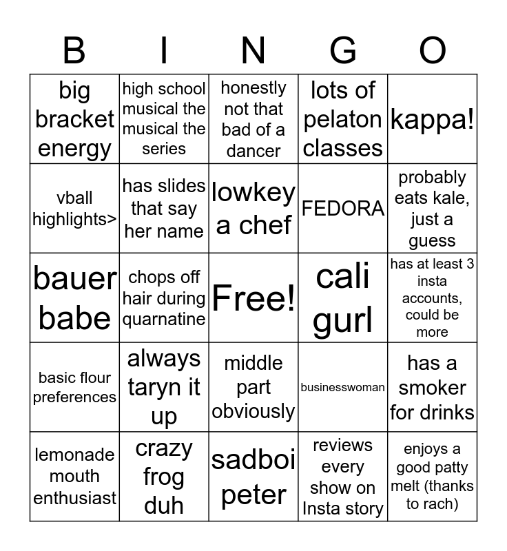 This bingo card has a free space and 24 words: always taryn it up, crazy frog duh, lowkey a chef, lemonade mouth enthusiast, kappa!, big bracket energy, vball highlights>, high school musical the musical the series, cali gurl, middle part obviously, FEDORA, bauer babe, businesswoman, has a smoker for drinks, has slides that say her name, reviews every show on Insta story, has at least 3 insta accounts, could be more, honestly not that bad of a dancer, probably eats kale, just a guess, chops off hair during quarnatine, enjoys a good patty melt (thanks to rach), basic flour preferences, lots of pelaton classes and sadboi peter.
