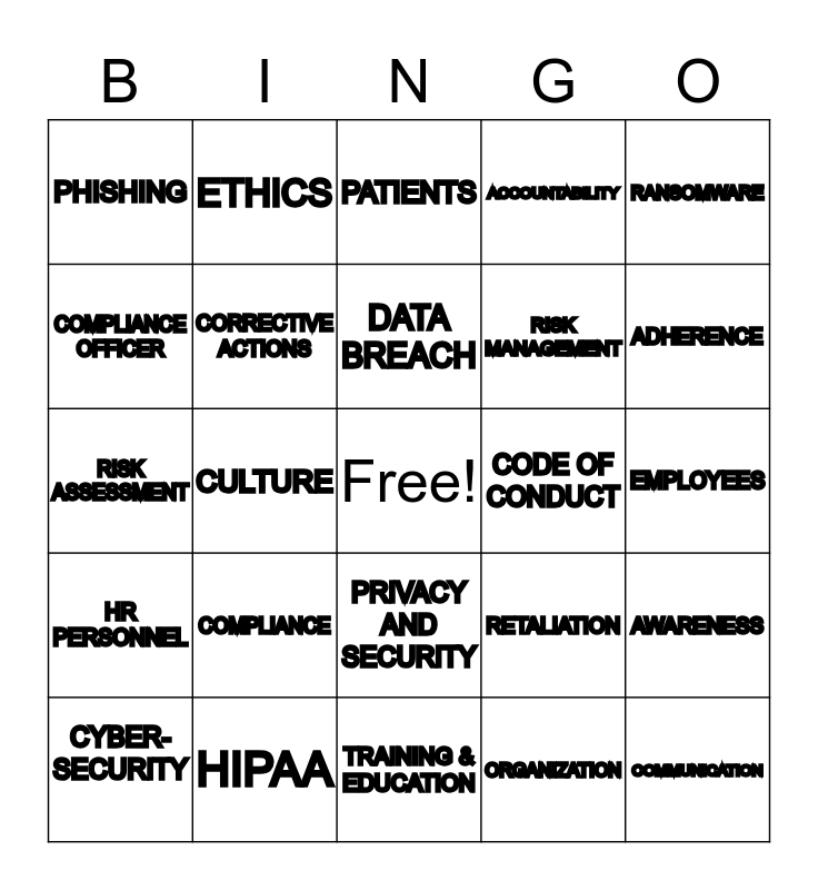 This bingo card has a free space and 24 words: COMPLIANCE, HIPAA, DATA BREACH, CYBER-SECURITY, RANSOMWARE, PHISHING, COMPLIANCE OFFICER, ETHICS, CODE OF CONDUCT, PRIVACY AND SECURITY, RISK MANAGEMENT, RISK ASSESSMENT, RETALIATION, AWARENESS, CORRECTIVE ACTIONS, ORGANIZATION, EMPLOYEES, PATIENTS, ADHERENCE, CULTURE, COMMUNICATION, HR PERSONNEL, ACCOUNTABILITY and TRAINING & EDUCATION.