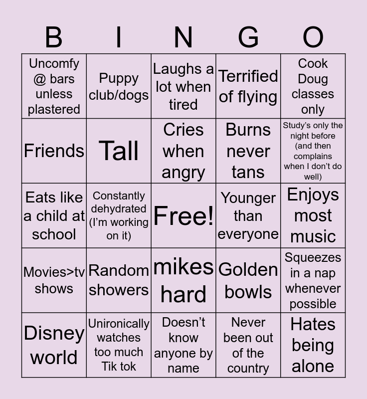 This bingo card has a free space and 24 words: Random showers, Unironically watches too much Tik tok, Cries when angry, Disney world, Cook Doug classes only, Uncomfy @ bars unless plastered, Friends, Puppy club/dogs, Younger than everyone, mikes hard, Burns never tans, Eats like a child at school, Golden bowls, Squeezes in a nap whenever possible, Tall, Never been out of the country, Enjoys most music, Laughs a lot when tired, Study’s only the night before (and then complains when I don’t do well), Constantly dehydrated (I’m working on it), Hates being alone, Movies>tv shows, Terrified of flying and Doesn’t know anyone by name.