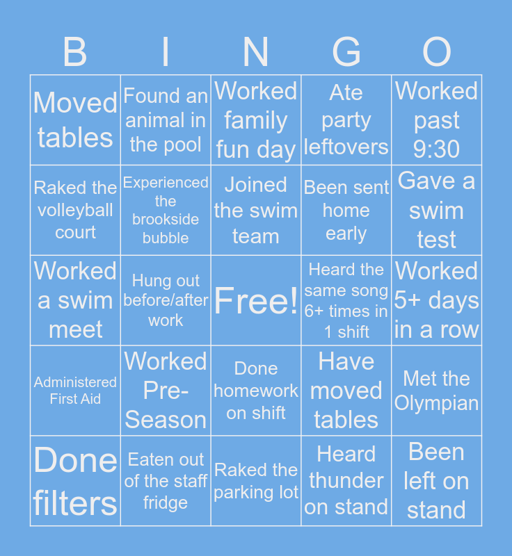 This bingo card has a free space and 24 words: Worked Pre-Season, Eaten out of the staff fridge, Joined the swim team, Done filters, Worked past 9:30, Moved tables, Raked the volleyball court, Found an animal in the pool, Heard the same song 6+ times in 1 shift, Done homework on shift, Been sent home early, Worked a swim meet, Have moved tables, Met the Olympian, Experienced the brookside bubble, Heard thunder on stand, Worked 5+ days in a row, Worked family fun day, Gave a swim test, Hung out before/after work, Been left on stand, Administered First Aid, Ate party leftovers and Raked the parking lot.