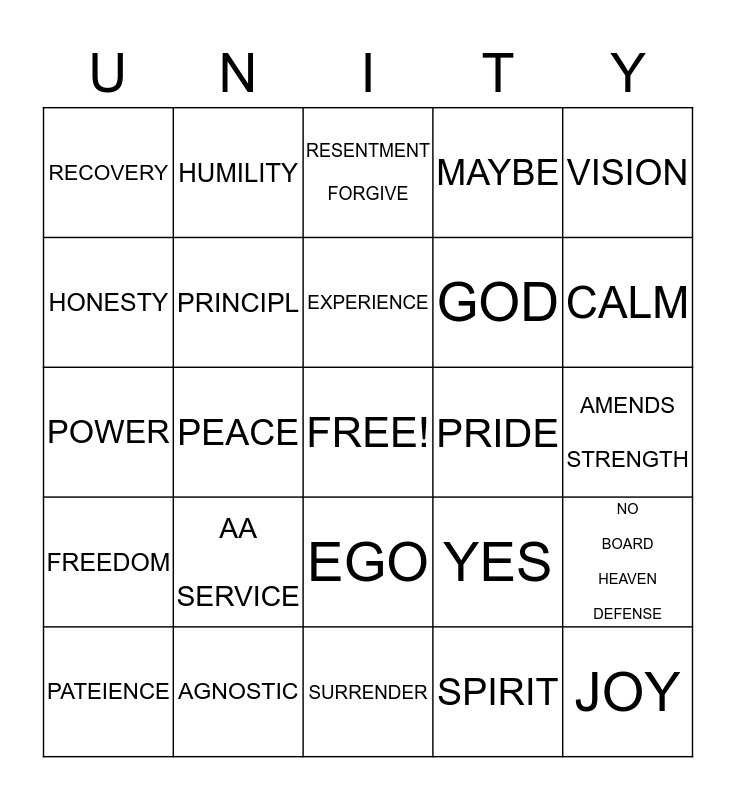 This bingo card has a free space and 24 words: AA SERVICE, AGNOSTIC, EXPERIENCE, PATEIENCE, VISION, RECOVERY, HONESTY, HUMILITY, PRIDE, EGO, GOD, POWER, YES, NO BOARD HEAVEN DEFENSE, PRINCIPL, SPIRIT, AMENDS STRENGTH, RESENTMENT FORGIVE, CALM, PEACE, JOY, FREEDOM, MAYBE and SURRENDER.