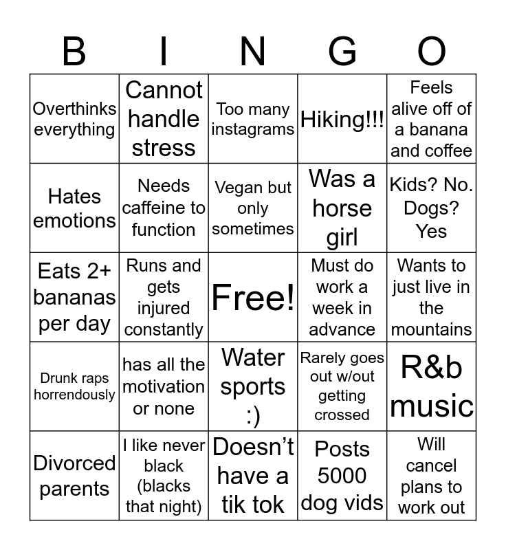 This bingo card has a free space and 24 words: has all the motivation or none, I like never black (blacks that night), Vegan but only sometimes, Divorced parents, Feels alive off of a banana and coffee, Overthinks everything, Hates emotions, Cannot handle stress, Must do work a week in advance, Water sports :), Was a horse girl, Eats 2+ bananas per day, Rarely goes out w/out getting crossed, R&b music, Needs caffeine to function, Posts 5000 dog vids, Wants to just live in the mountains, Too many instagrams, Kids? No. Dogs? Yes, Runs and gets injured constantly, Will cancel plans to work out, Drunk raps horrendously, Hiking!!! and Doesn’t have a tik tok.