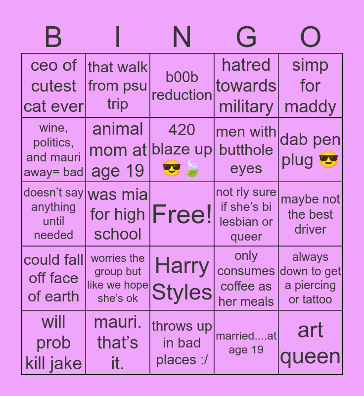 This bingo card has a free space and 24 words: worries the group but like we hope she’s ok, mauri. that’s it., 420 blaze up 😎🍃, will prob kill jake, simp for maddy, ceo of cutest cat ever, wine, politics, and mauri away= bad, that walk from psu trip, not rly sure if she’s bi lesbian or queer, Harry Styles, men with butthole eyes, doesn’t say anything until needed, only consumes coffee as her meals, always down to get a piercing or tattoo, animal mom at age 19, married....at age 19, maybe not the best driver, b00b reduction, dab pen plug 😎, was mia for high school, art queen, could fall off face of earth, hatred towards military and throws up in bad places :/.