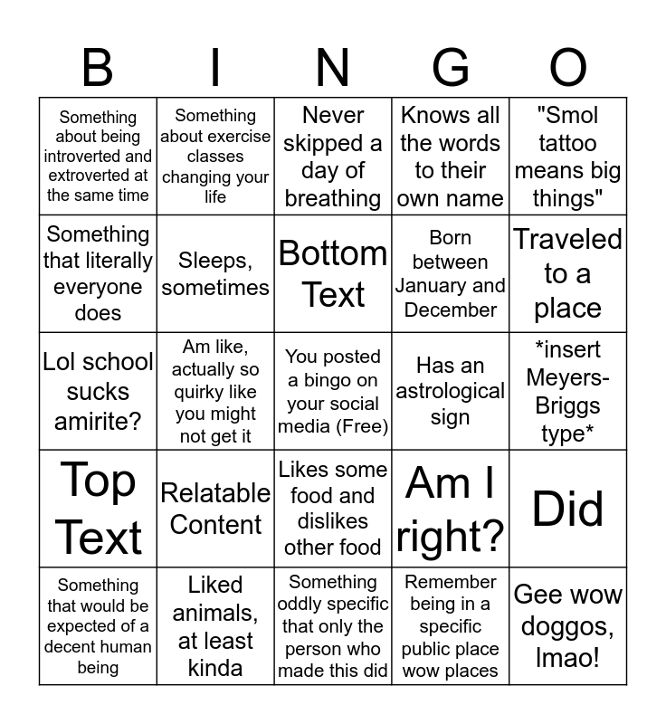 This bingo card has a free space and 24 words: Relatable Content, Liked animals, at least kinda, Bottom Text, Something that would be expected of a decent human being, "Smol tattoo means big things", Something about being introverted and extroverted at the same time, Something that literally everyone does, Something about exercise classes changing your life, Has an astrological sign, Likes some food and dislikes other food, Born between January and December, Lol school sucks amirite?, Am I right?, Did, Sleeps, sometimes, Remember being in a specific public place wow places, *insert Meyers-Briggs type*, Never skipped a day of breathing, Traveled to a place, Am like, actually so quirky like you might not get it, Gee wow doggos, lmao!, Top Text, Knows all the words to their own name and Something oddly specific that only the person who made this did.