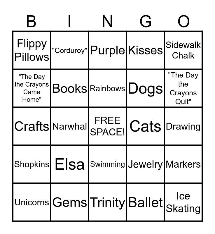 This bingo card has a free space and 29 words: Unicorns, Pink, Narwhal, Silly, Flippy Pillows, Purple, Books, Elsa, Cats, Gems, Drawing, Ice Skating, Trinity, Ballet, "The Day the Crayons Quit", Barbie, Swimming, Shopkins, Sidewalk Chalk, Crafts, Jewelry, Dress Up, Dogs, "The Day the Crayons Came Home", Kisses, "Corduroy", Markers, Rainbows and Kate the Fish.