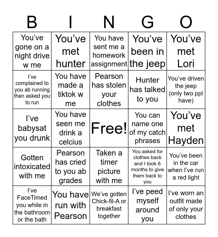This bingo card has a free space and 24 words: Pearson has cried to you ab grades, You have run with Pearson, Pearson has stolen your clothes, I’ve FaceTimed you while in the bathroom or the bath, You’ve met Lori, You’ve gone on a night drive w me, I’ve complained to you ab running then asked you to run, You’ve met hunter, You can name one of my catch phrases, Taken a timer picture with me, Hunter has talked to you, I’ve babysat you drunk, You asked for clothes back and I took 6 months to give them back to you, You’ve been in the car when I’ve run a red light, You have made a tiktok w me, I’ve peed myself around you, You’ve met Hayden, You have sent me a homework assignment, You’ve driven the jeep (only two ppl have), You have seen me drink a celcius, I’ve worn an outfit made of only your clothes, Gotten intoxicated with me, You’ve been in the jeep and We’ve gotten Chick-fil-A or breakfast together.