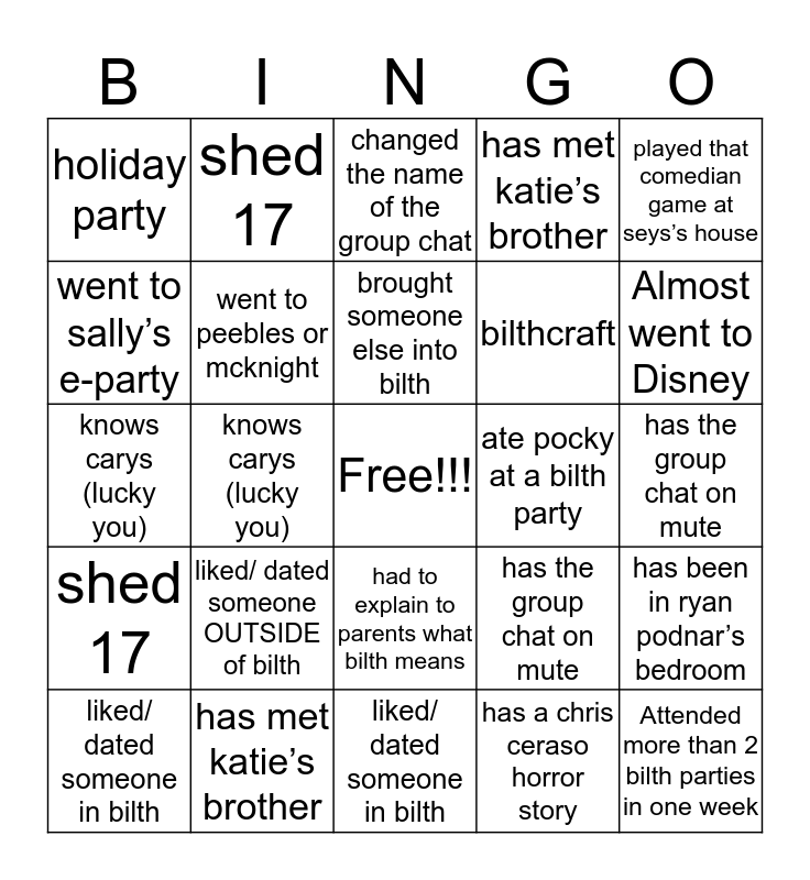 This bingo card has a free space and 48 words: shared HW in the chat, Attended more than 2 bilth parties in one week, Almost went to Disney, liked/ dated someone in bilth, liked/ dated someone OUTSIDE of bilth, had to explain to parents what bilth means, shed 17, watched seys’s tiktoks, went to sally’s e-party, actually WATCHES the tiktoks people send, went to peebles or mcknight, has met katie’s brother, has been in ryan podnar’s bedroom, has the group chat on mute, has sent a tiktok to bilth, did secret santa, brought someone else into bilth, ate pocky at a bilth party, changed the name of the group chat, played that comedian game at seys’s house, knows carys (lucky you), has a chris ceraso horror story, holiday party, bilthcraft, Attended more than 2 bilth parties in one week, Almost went to Disney, liked/ dated someone in bilth, liked/ dated someone OUTSIDE of bilth, had to explain to parents what bilth means, shed 17, made new friends from bilth :), went to sally’s e-party, actually WATCHES the tiktoks people send, went to peebles or mcknight, has met katie’s brother, shared HW in the chat, has been in ryan podnar’s bedroom, has the group chat on mute, has sent a tiktok to bilth, did secret santa, brought someone else into bilth, ate pocky at a bilth party, changed the name of the group chat, played that comedian game at seys’s house, knows carys (lucky you), has a chris ceraso horror story, holiday party and bilthcraft.