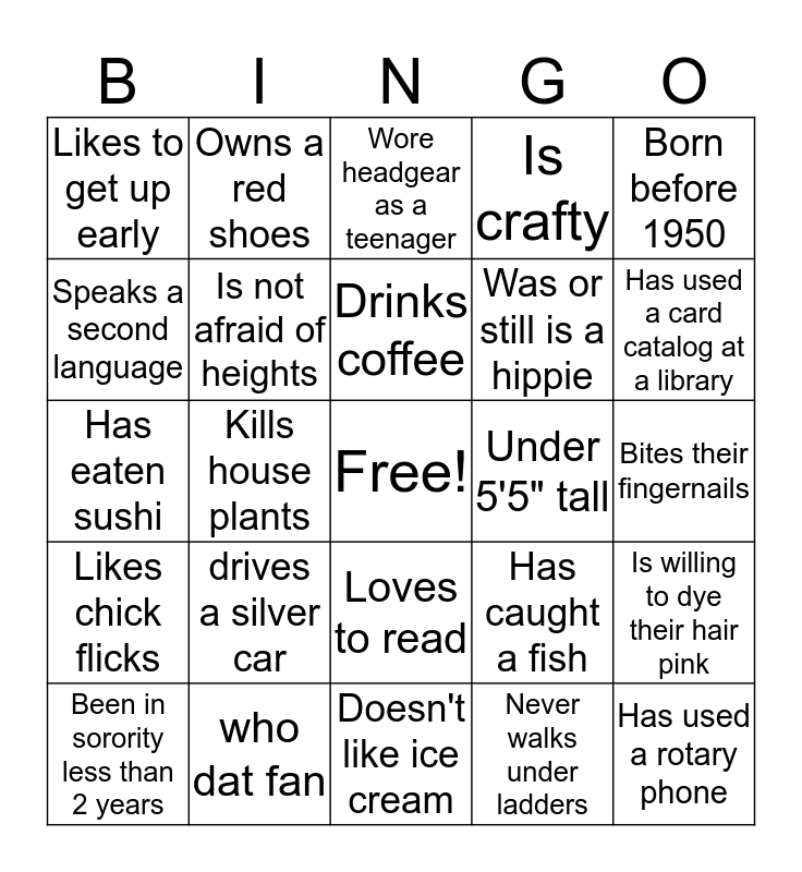 This bingo card has a free space and 24 words: drives a silver car, who dat fan, Drinks coffee, Been in sorority less than 2 years, Born before 1950, Likes to get up early, Speaks a second language, Owns a red shoes, Under 5'5" tall, Loves to read, Was or still is a hippie, Has eaten sushi, Has caught a fish, Is willing to dye their hair pink, Is not afraid of heights, Never walks under ladders, Bites their fingernails, Wore headgear as a teenager, Has used a card catalog at a library, Kills house plants, Has used a rotary phone, Likes chick flicks, Is crafty and Doesn't like ice cream.