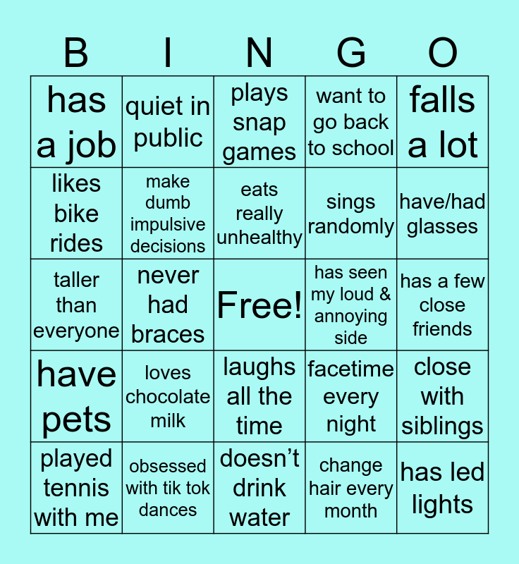 This bingo card has a free space and 24 words: loves chocolate milk, obsessed with tik tok dances, eats really unhealthy, played tennis with me, falls a lot, has a job, likes bike rides, quiet in public, has seen my loud & annoying side, laughs all the time, sings randomly, taller than everyone, facetime every night, close with siblings, make dumb impulsive decisions, change hair every month, has a few close friends, plays snap games, have/had glasses, never had braces, has led lights, have pets, want to go back to school and doesn’t drink water.