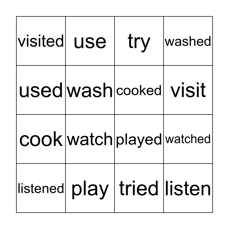 This bingo card has 16 words: play, watched, try, visited, cook, use, played, tried, used, wash, listened, washed, watch, visit, cooked and listen.