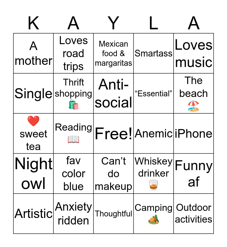 This bingo card has a free space and 24 words: fav color blue, Anxiety ridden, Anti-social, Artistic, Loves music, A mother, Single, Loves road trips, Anemic, Can’t do makeup, “Essential”, ❤️ sweet tea, Whiskey drinker 🥃, Funny af, Thrift shopping 🛍, Camping 🏕, iPhone, Mexican food & margaritas, The beach 🏖, Reading 📖, Outdoor activities, Night owl, Smartass and Thoughtful.