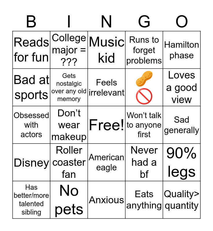 This bingo card has a free space and 24 words: Roller coaster fan, No pets, Feels irrelevant, Has better/more talented sibling, Hamilton phase, Reads for fun, Bad at sports, College major = ???, Won’t talk to anyone first, American eagle, 🥜 🚫, Obsessed with actors, Never had a bf, 90% legs, Gets nostalgic over any old memory, Eats anything, Sad generally, Music kid, Loves a good view, Don’t wear makeup, Quality> quantity, Disney, Runs to forget problems and Anxious.