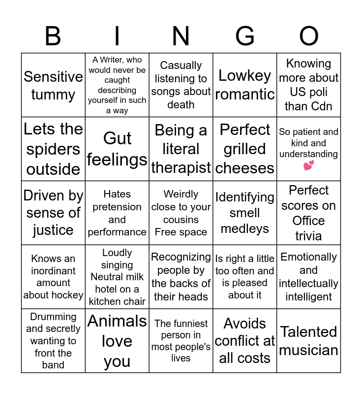 This bingo card has a free space and 24 words: Loudly singing Neutral milk hotel on a kitchen chair, Animals love you, Being a literal therapist, Drumming and secretly wanting to front the band, Knowing more about US poli than Cdn, Sensitive tummy, Lets the spiders outside, A Writer, who would never be caught describing yourself in such a way, Identifying smell medleys, Recognizing people by the backs of their heads, Perfect grilled cheeses, Driven by sense of justice, Is right a little too often and is pleased about it, Emotionally and intellectually intelligent, Gut feelings, Avoids conflict at all costs, Perfect scores on Office trivia, Casually listening to songs about death, So patient and kind and understanding 💕, Hates pretension and performance, Talented musician, Knows an inordinant amount about hockey, Lowkey romantic and The funniest person in most people's lives.
