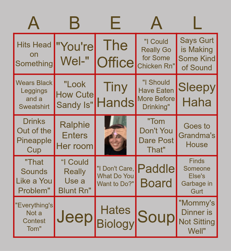 This bingo card has a free space and 24 words: “I Could Really Use a Blunt Rn", Jeep, Tiny Hands, "Everything's Not a Contest Tom", Says Gurt is Making Some Kind of Sound, Hits Head on Something, Wears Black Leggings and a Sweatshirt, "You're Wel-", "Tom Don't You Dare Post That", "I Don't Care, What Do You Want to Do?", "I Should Have Eaten More Before Drinking", Drinks Out of the Pineapple Cup, Paddle Board, Finds Someone Else's Garbage in Gurt, "Look How Cute Sandy Is", Soup, Goes to Grandma's House, The Office, Sleepy Haha, Ralphie Enters Her room, "Mommy's Dinner is Not Sitting Well", "That Sounds Like a You Problem", "I Could Really Go for Some Chicken Rn" and Hates Biology.